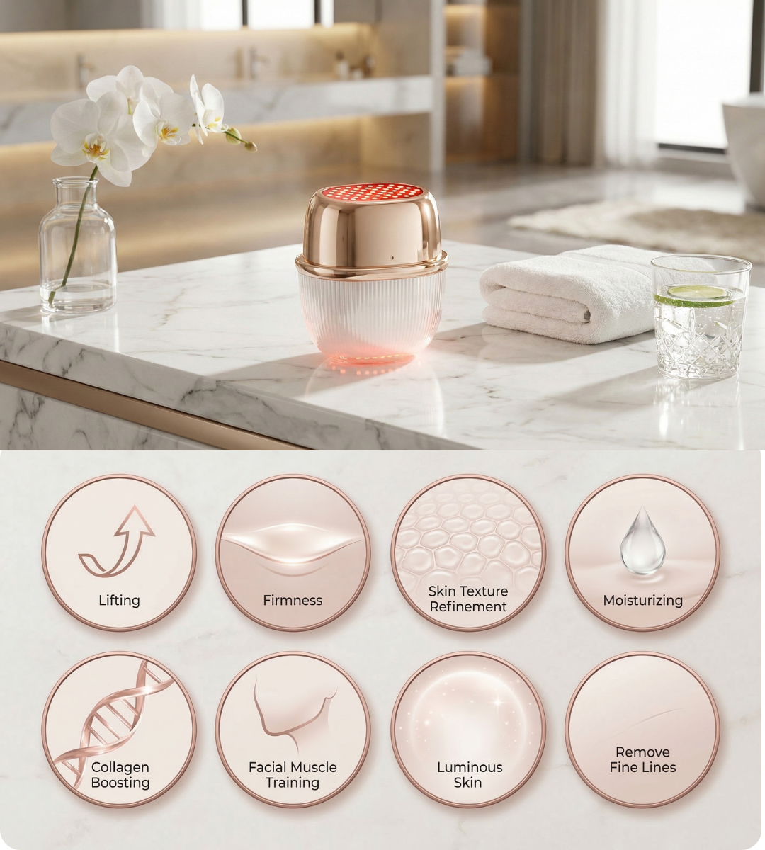 Thermal Collagen Stimulation (42°C): Safely penetrates deeper layers to awaken the skin's natural regenerative abilities, delivered through a highly efficient gold-plated head, stimulates collagen production to revitalize your skin from the inside out.